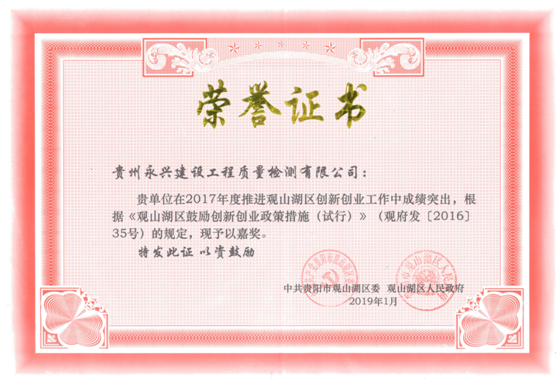 因公司在2017年度推进观山湖区创新创业工作中成绩突出,中共贵阳市观山湖区委和区人民政府于2019年1月向公司颁发了荣誉证书。