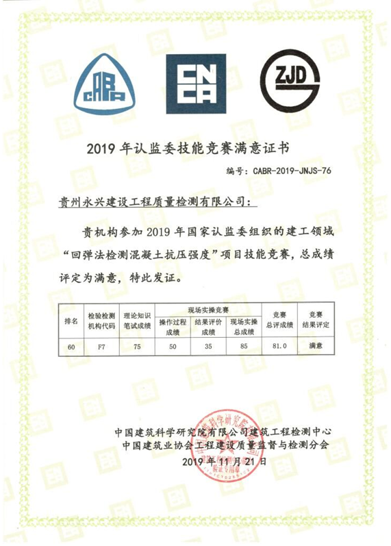2019年9月25至26日,公司地基结构部赵建、闫杰在北京参加了首届“全国建工检验检测领域回弹法检测混凝土抗压强度技能竞赛”,并取得了“满意”结果。
