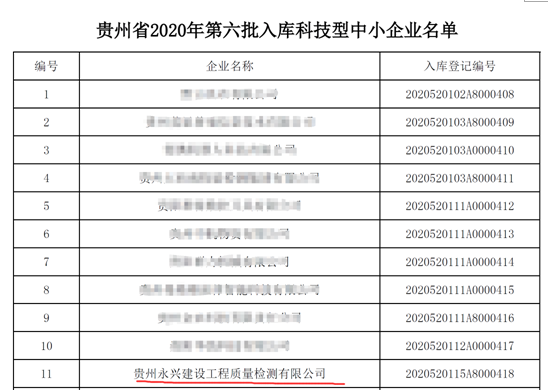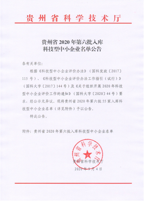 公司于2020年9月4日通过了贵州省科学技术厅对科技型中小企业的评价,成功入库贵州省2020年第六批科技型中小企业