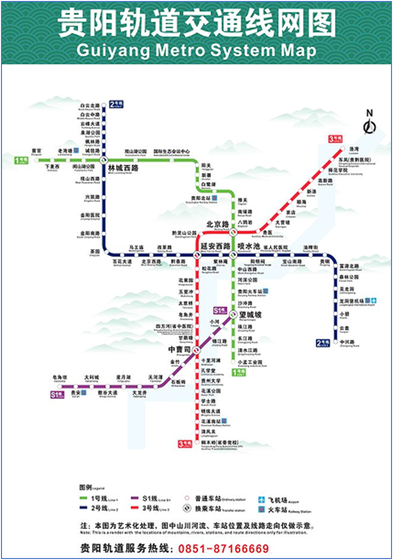 贵阳轨道交通S1线起于贵安新区皂角坝站,途经花溪区、经开区,止于南明区望城坡站。全长30.32公里,有22.64公里的地下线,7.68公里的高架及地面线,设车站13座。车辆为4动2拖6节编组的B型车,全线共配置20列电客车,座席308个,最大载客量可达2048人,最高运行速度为100km/h。列车客室内采用“2+2”横纵向混合布置座椅以及全新工业设计风格的“6对电动塞拉门”。
